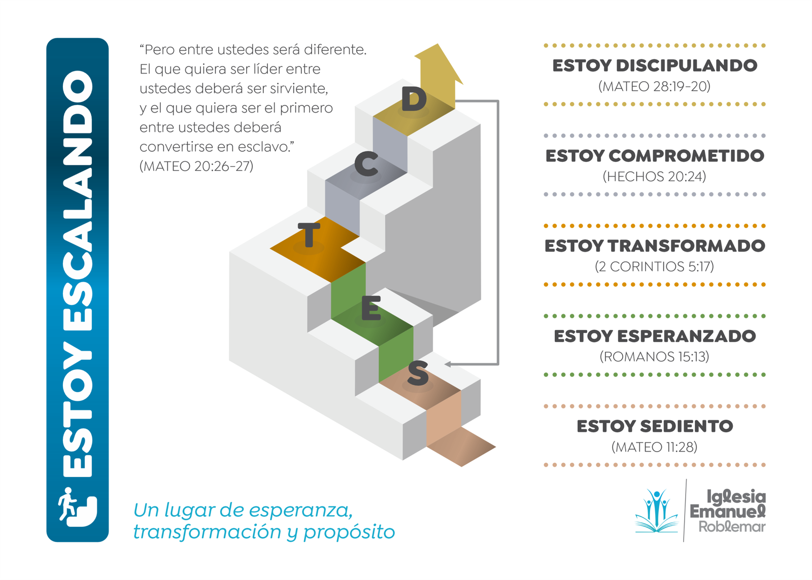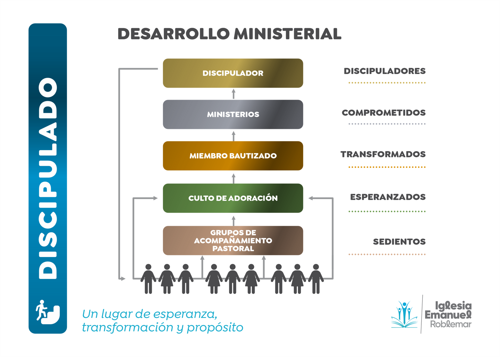 El propósito de nuestra iglesia es dirigir las personas a ser discípulos maduros de Jesucristo que sean discípulos hacedores de discípulos. Animamos a nuestros miembros a dar el siguiente paso en su vida cristiana, todos comenzamos como hombres y mujeres sedientos de Dios, luego al comenzar a asistir a los cultos de adoración nos convertimos en Esperanzados, hombres y mujeres que están a la expectativa de ver cómo Dios obra en nuestras vidas. Después de tener un encuentro personal con Jesucristo, debemos comenzar a dar pasos en nuestra vida que hablen de lo que Dios está haciendo en nosotros y con nosotros. Por tanto, animamos a que nuestros miembros avancen a través del discipulado: